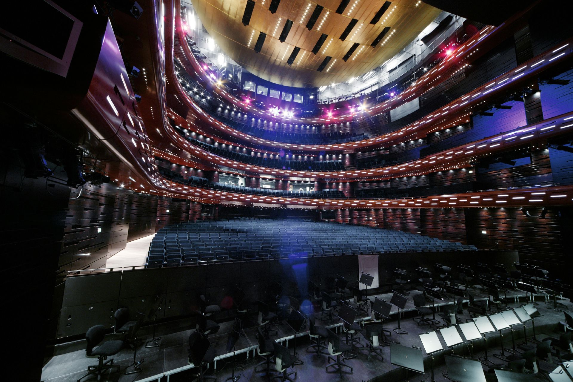 Følg med ind i salens dunkle atmosfære hvor det forgyldte loft og glødende træværk er i centrum. Kom om bag scenen hvor flytbare scenefelter gør det muligt at flytte gigantiske og komplekse scenografier i en håndevending, og hvor højteknologiske løsninger muliggør teatermagi og illusioner, som ikke kan opnås andre steder i landet. Se kontrasten mellem Store Scene og Takkelloftet hvor fleksibilitet er nøgleordet og lader scene og sal flyde sammen. Se også Takkelloftets stringente foyer hvor kunstneren, Tal Rs, moderne abstraktion har hovedrollen.