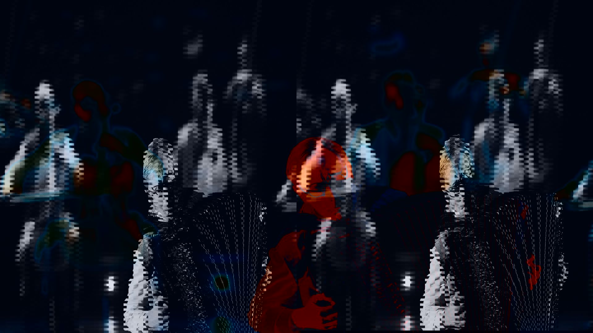 I denne hvirvlende dans er den verdenskendte finske violinvirtuos Pekka Kuusisto i front og fra Danmark kommer den prisbelønnede akkordeonspiller Bjarke Mogensen i en rolle som Shostakovich alter ego.