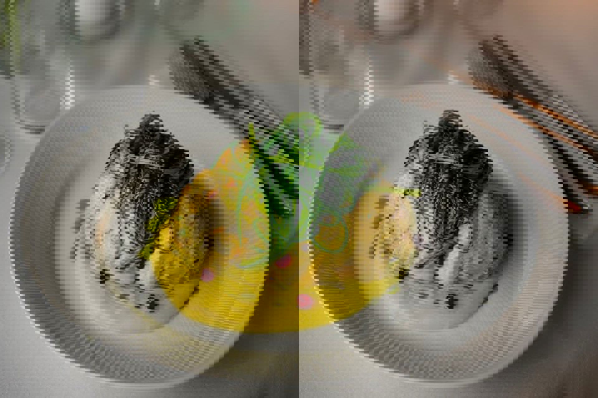 Kyllingebryst med grillede grøntsager og sauce velouté.